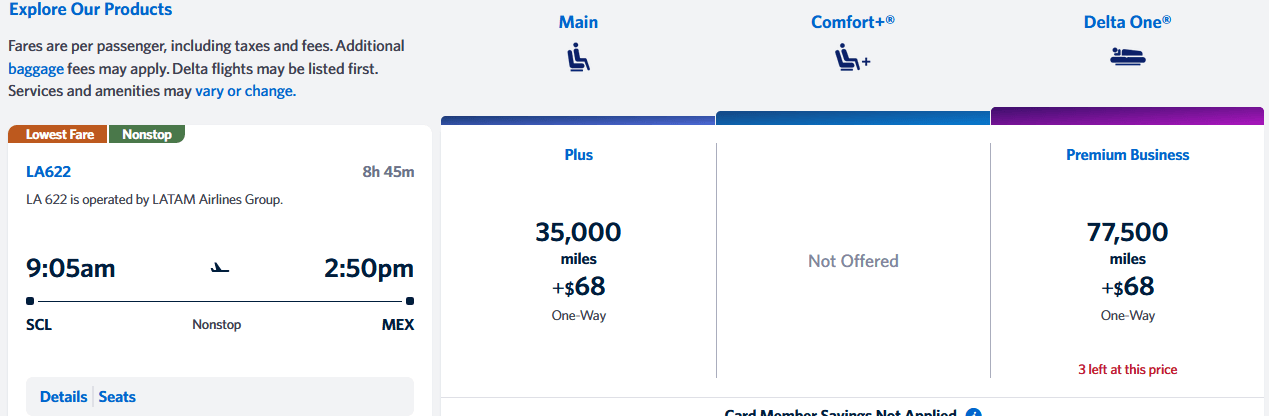 Once you go beyond South America, there is a standard fare for LATAM flights. For example, Santiago to Mexico City on LATAM goes for 35,000 SkyMiles in economy and 77,500 miles in business class.