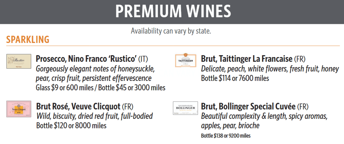 There's a nice exception, though. Enjoy a premium drink at the Sky Club bar, and you can actually get a better deal than one cent per point. How about a bottle of Brut, Taittinger La Francaise for 7,600 miles? That’s better than paying $114 in cash.