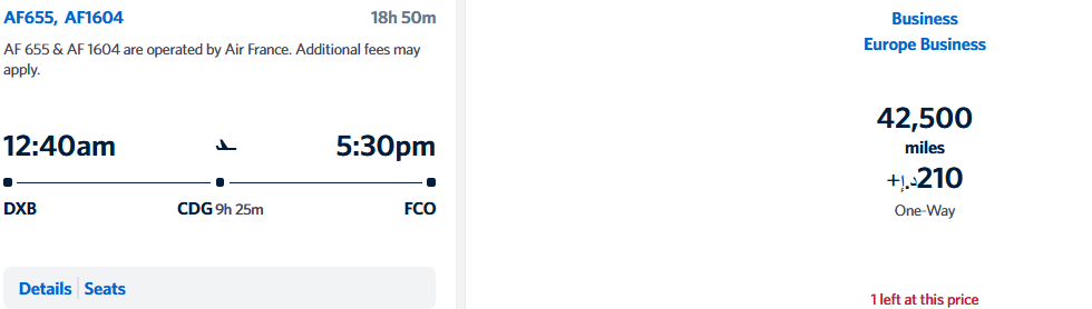 Flights between Europe and the Middle East are available 42,500 miles each way, although when originating in Europe, the taxes are high. Still, it’s a good deal for business class as the above example shows.