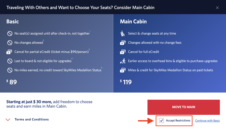 By checking the box, you avoid any miscommunications about the kind of fare you’re purchasing and acknowledge the restrictions associated with a basic economy ticket on Delta.