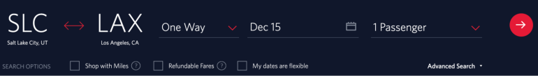 Booking a basic economy ticket with Delta is quite easy. Search for a flight like you normally would — enter the city pair, travel dates and the number of passengers. Select the red arrow to view the results. In this example, we’re looking for a one-way ticket from Salt Lake City to Los Angeles on Dec. 15.