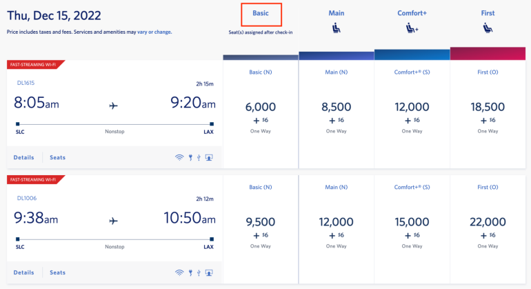 Because you won’t earn rewards on basic economy flights paid with cash, you might as well redeem miles to book one of these fares and save the money for a future trip. In our example flight from Salt Lake City to Los Angeles, the earlier flight costs $89 and the later flight is $129. If you were to pay with miles, the rates are also different: 6,000 SkyMiles and 9,500 SkyMiles, respectively.