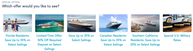The special offers filter will let you know what types of discounts are available, like the example above promoting up to 35% off on select sailings.