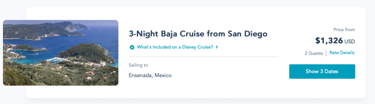 The cheapest cruises you’ll find tend to sail from San Diego, and they’re the shortest trips as well. We searched for sailings across the calendar and found the cheapest rates rang in at $1,326 for two guests in an inside room on a three-night trip from San Diego.