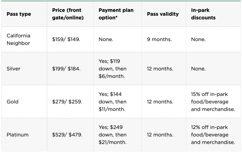 Gold | $279/$259. | Yes; $144 down, then $11/month. | 12 months. | 15% off in-park food/beverage and merchandise. |
