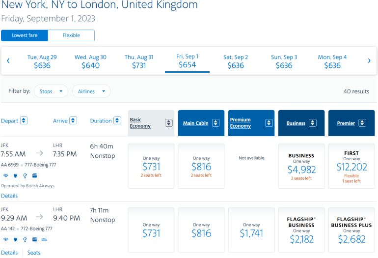 On the Airbus A321T and the Boeing 777-300ER planes, this fare isn't available because those planes still have Flagship First class (which American plans to phase out).