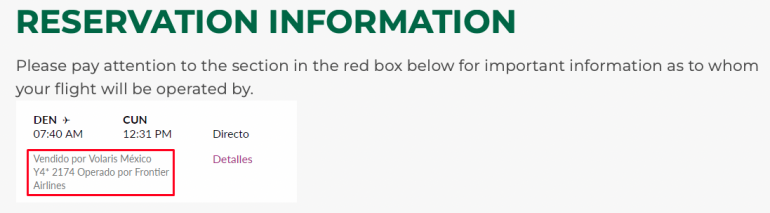 These tickets will be listed online with a note that states “this flight is operated by Volaris” if you’re booking on Frontier’s website or “this flight is operated by Frontier” on the Volaris website.
