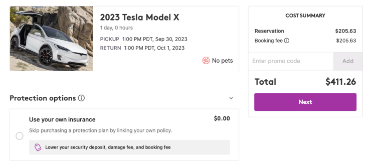 First, you’ll need to create an account on Getaround, which includes entering your driver’s license information. At booking, you decide what type of insurance add-ons you want to purchase (more on that later) and make your payment.