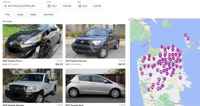 Getaround has far more pickup locations than you would find when looking for car rental counters. For example, when renting a car in San Francisco, you’re generally limited to downtown and Fisherman’s Wharf. Meanwhile, you can find Getaround cars in quiet, residential neighborhoods, and most cars can also be rented by the hour, which is convenient if you want it for part of the day.