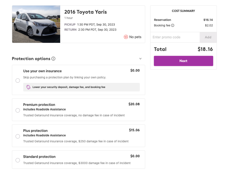 Getaround’s protection plans vary based on the specific booking. Shorter trips can cost more than the actual reservation cost. In the example below, a one-hour rental that would cost about $16 to rent also comes with the option to pay $15 extra for “Plus protection,” or $20 extra for “Premium protection.”