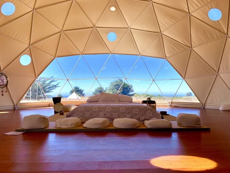 Drive about 45 minutes north of the bustling Santa Cruz Boardwalk and you’ll find the Big Om Ocean Retreat, a glampsite with unobstructed ocean and mountain views. As you drive up, you’ll see pastures of grazing horses that live in the adjacent animal sanctuary. For an additional fee, you can participate in animal-guided healing or a ranch tour.