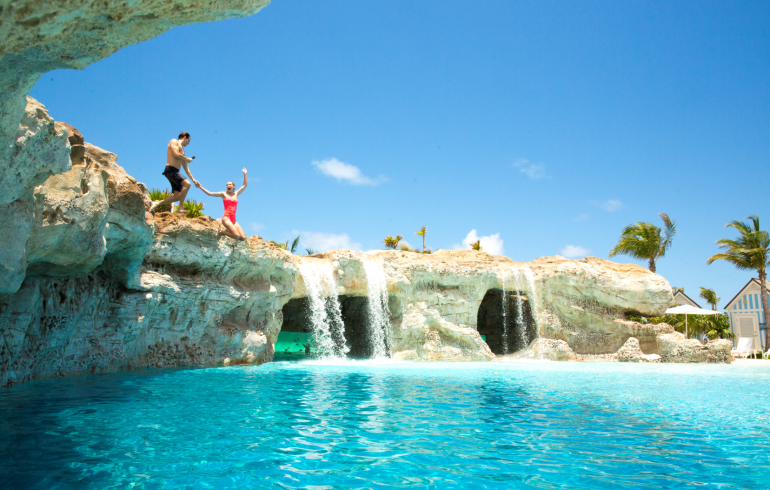 Start with one of the seven pools available to Grand Hyatt Baha Mar guests. They feature whirlpools, waterfalls and swim-up bars, and one pool even has a built-in aquarium in a shaded cave where you can watch fish and sharks swim by you. Plus, there is a rock jump where you can climb up 15 feet and then plunge into the pool below for fun.