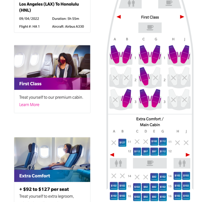 First, search for your desired itinerary on HawaiianAirlines’ website, then select a main cabin fare. (Basic fares cannot be upgraded to Extra Comfort.) Click “view seats” to pull up the map showing which seats are available.