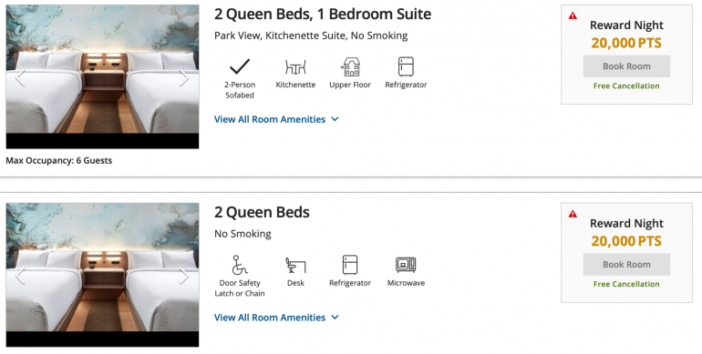 Hilton doesn’t operate a fixed award chart — instead, the cost of reward nights fluctuates according to demand. It offers standard room redemptions and premium room rewards. You likely won’t find any Hilton hotels with multiple room suites that offer a standard room redemption, but sometimes the prices you find won’t be overly exorbitant.