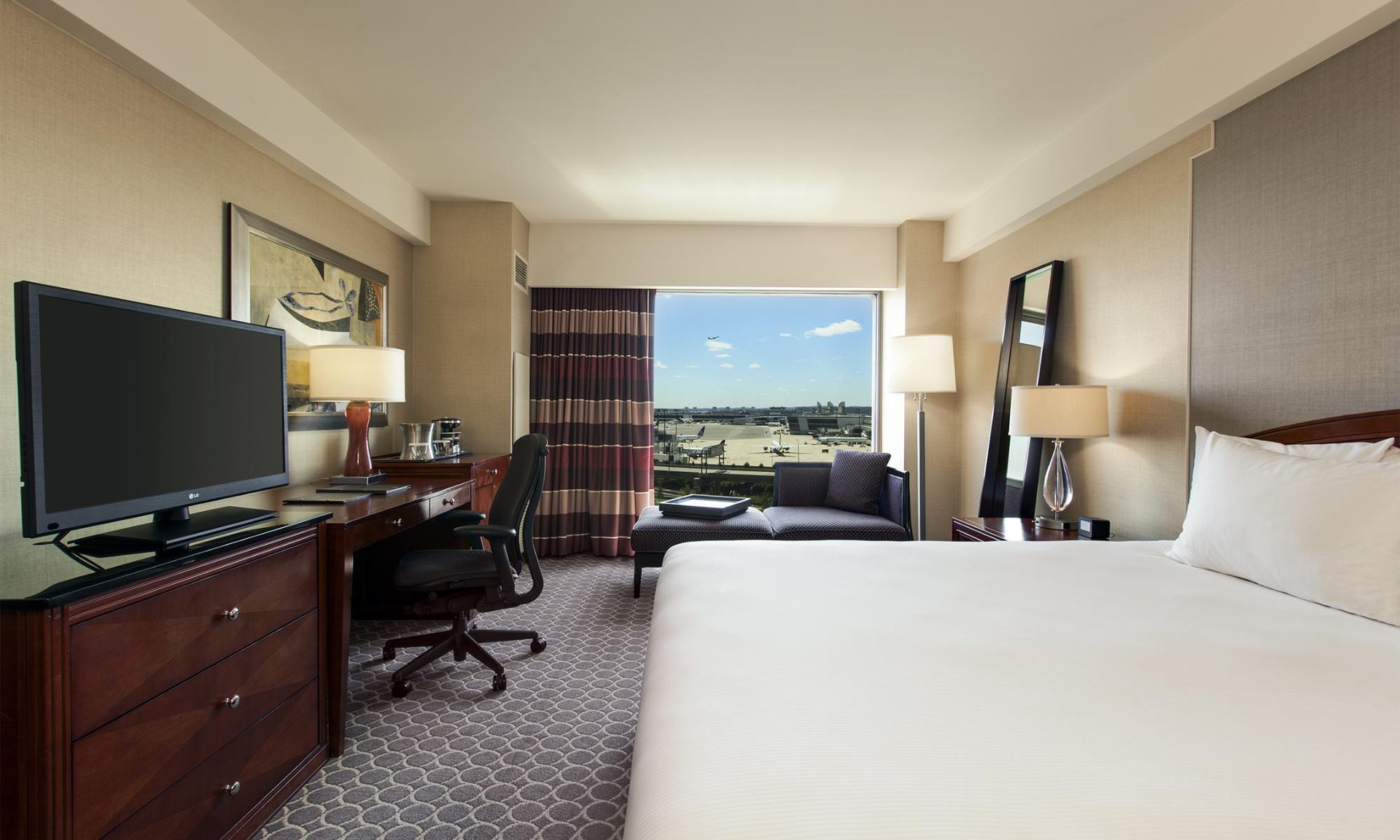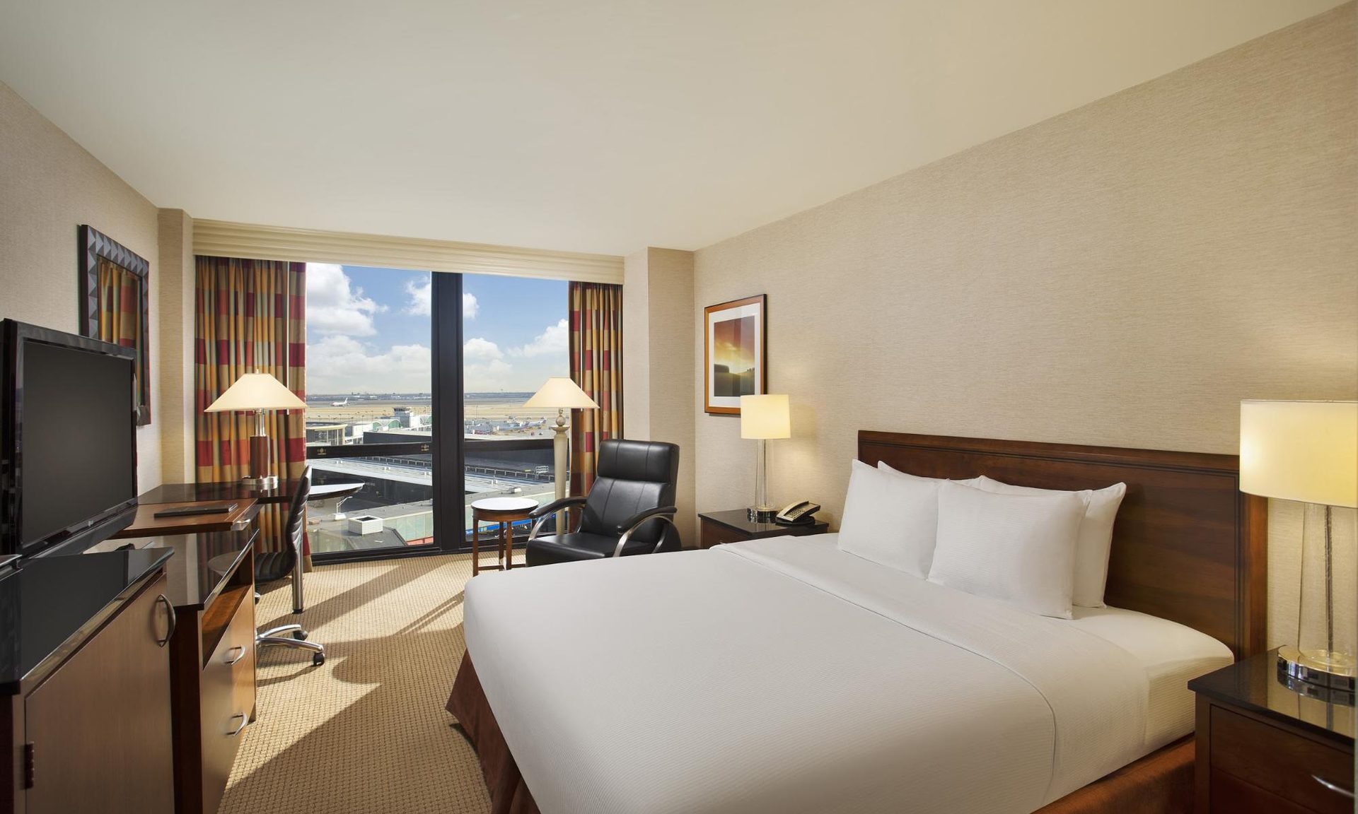 Many of its rooms look directly over the apron and runways, giving guests great views of the action at this busy international gateway. Though hotel guests can’t walk to the international terminals, there’s a shuttle available to ease the commute.