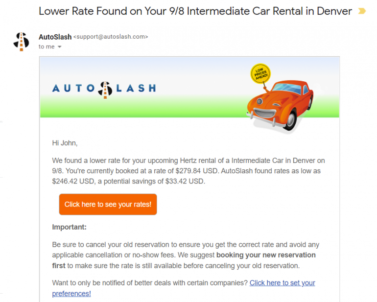 For example, a couple of weeks before a trip to Denver last September, AutoSlash sent a notification about a $33 price drop. Since AutoSlash included a link to the cheaper rate in the email, it took just a couple of minutes to rebook the newer lower rate and cancel the original booking.