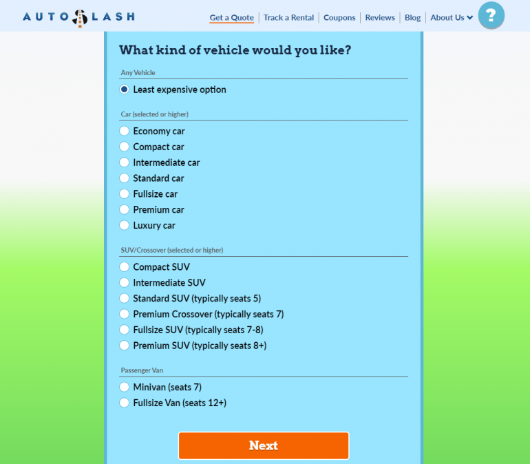 Next, AutoSlash will ask what type of vehicle you want to rent. For those that just want the cheapest rental car rates, AutoSlash has a "least expensive option" selection.