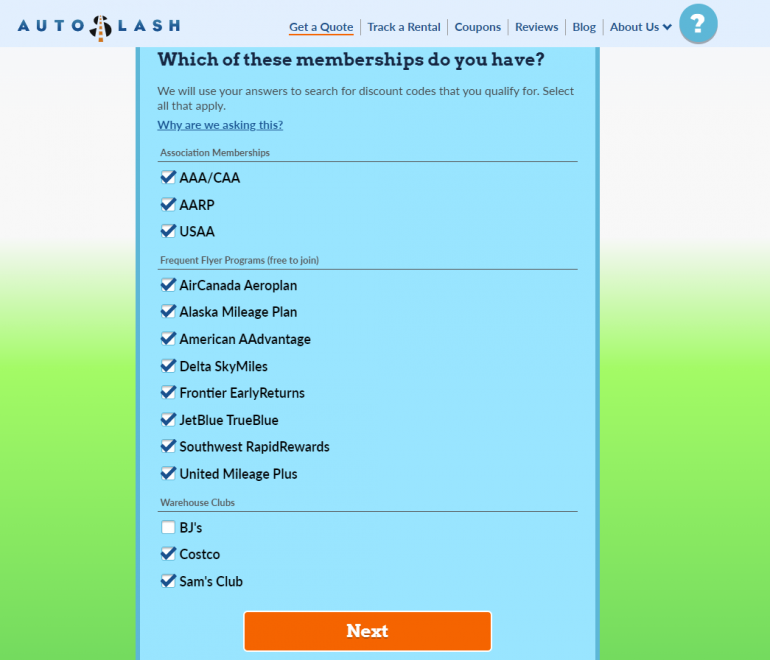 Then, you indicate which association memberships (AAA/CAA, AARP and USAA), frequent flyer programs and warehouse clubs you're a member of. If you aren't yet a member of one of these programs, AutoSlash notes which ones are free to join.