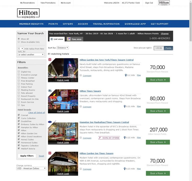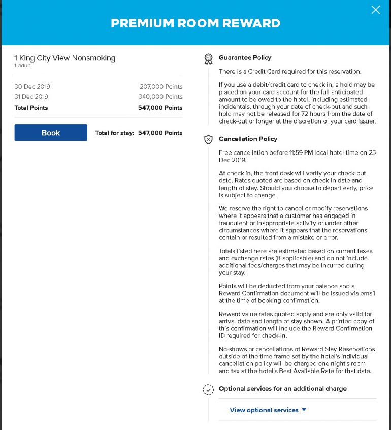 For example, I searched for points availability in New York City over New Year’s and found the Hampton Inn Manhattan/Times Square Central charging a total of 547,000 points for a two-night stay in a King City View Nonsmoking room.