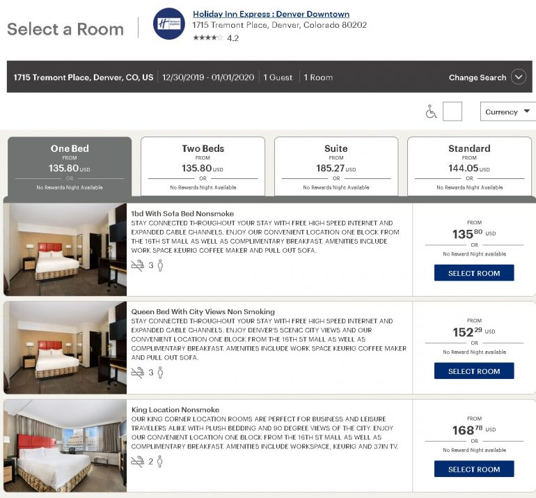 And while most of the IHG hotels we looked at do show award availability when a standard room is available, occasionally you’ll find awards are effectively blacked out. For example, the Holiday Inn Express Denver Downtown was unavailable over the New Year’s holiday, despite this hotel having standard rooms for sale starting at just $136.