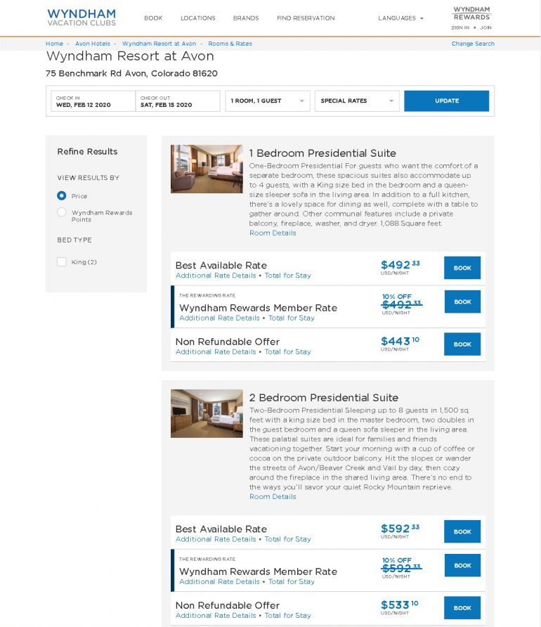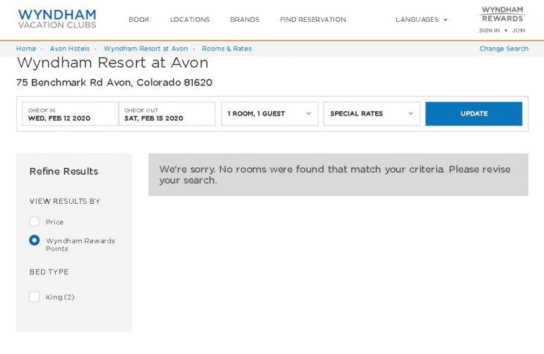 In practice, I’ve found that there are virtually no Go Free Condo awards available for Wyndham condos at Colorado ski resorts during the ski season. I also found that the Wyndham Resort at Avon (near Vail and Beaver Creek ski areas in Colorado) doesn’t seem to offer Go Free awards during the ski season at all, even when rooms are available otherwise. (Note that this hotel only offers rooms labeled as “Presidential Suite.”)