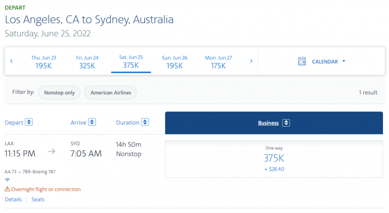 Award prices can climb way off the award chart to book a business or first class award on a popular international route. For example, American's award chart prices business class awards between the U.S. and the South Pacific between 80,000 and 195,000 miles. However, American Airlines currently charges as much as 375,000 miles each way to book a nonstop business class award from Los Angeles to Sydney: