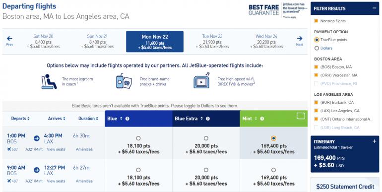 The downside of revenue-based pricing is that awards are very expensive when cash prices are very expensive. For example, during high-demand times, JetBlue's Mint business class can cost over 169,000 TrueBlue points each way.