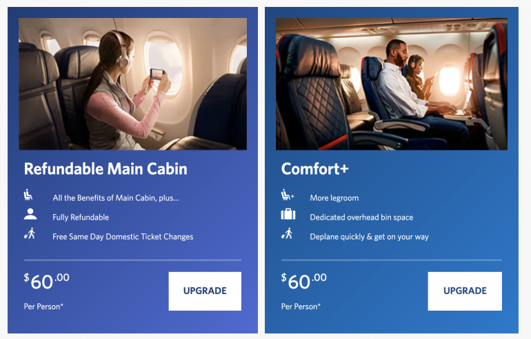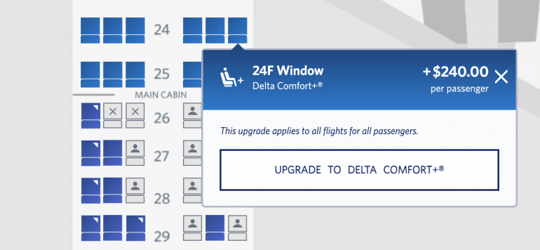 More often, this choice will be baked into the seat selection screen. For example, if you select a Comfort+ (premium economy) seat on Delta, you’ll see the cost of upgrading to this seat along with some of the perks.