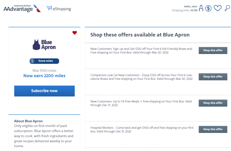 For example, say you want to sign up for the Blue Apron meal delivery service. Just by clicking through the American Airlines AAdvantage eShopping portal before you pay to subscribe, you'll currently earn 2,200 bonus miles.