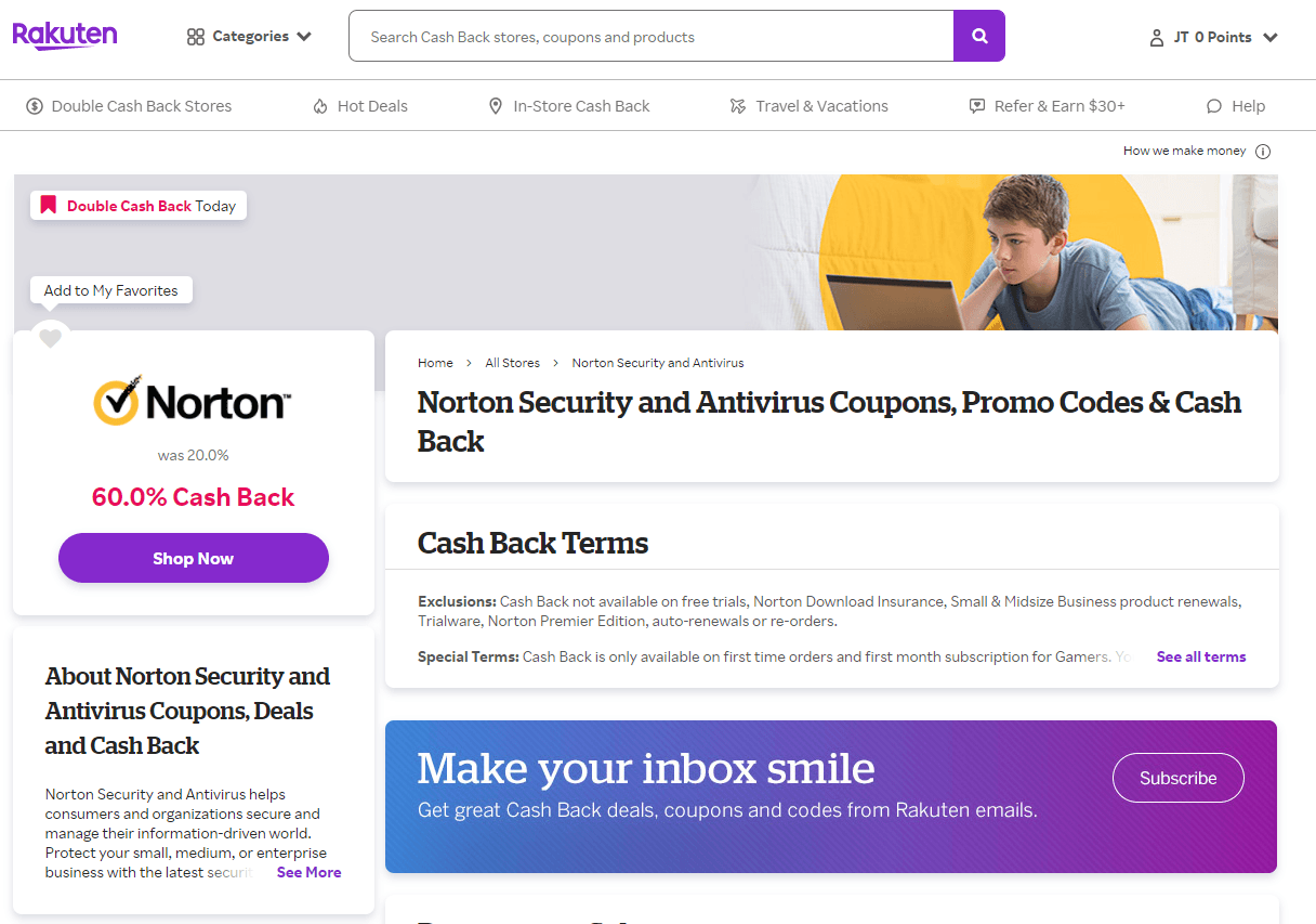 These earnings can add up. For example, Norton purchases through Rakuten currently earn 60% cash back — or 60x Membership Rewards points.