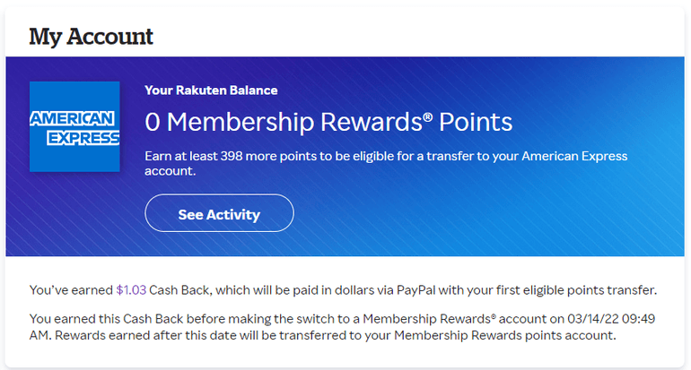 Rakuten members need to earn more than 500 points to be eligible to transfer points to your Membership Rewards account. If your balance is under 500 points, it will carry over into the next quarter. If you switch to earning points mid-quarter, you'll still get credit for the cash-back earnings you earned before the switch. For example, if you have $1.03 in accumulated cash back when you opt into earning Membership Rewards points, you need to earn another 398 points to prompt a payout.
