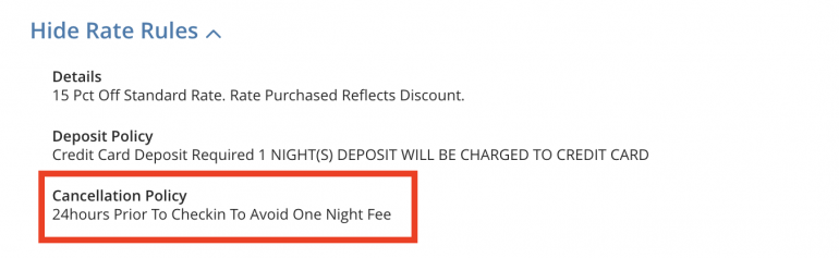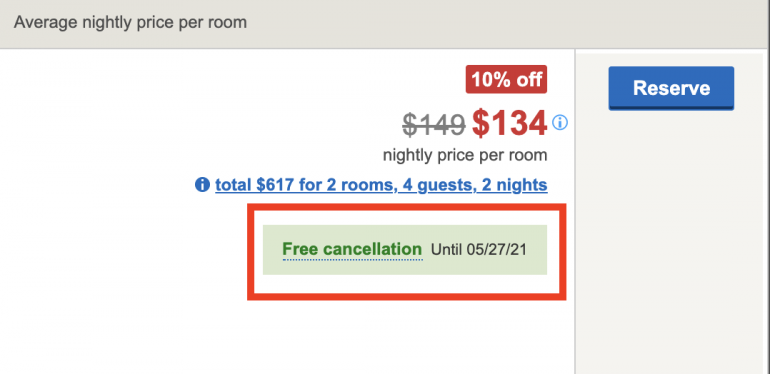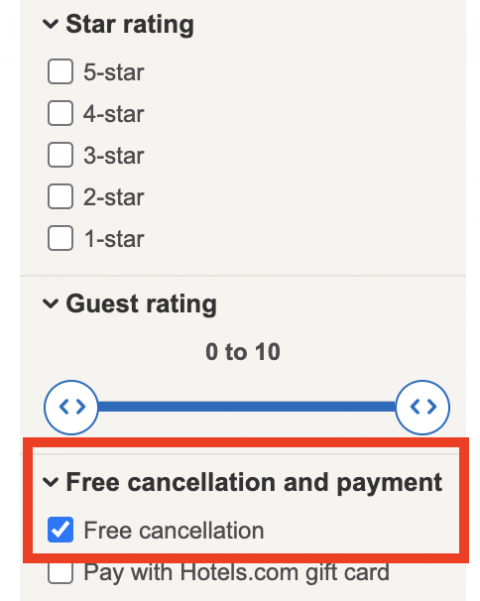 Look for a “cancellation policy” somewhere near the room rate. If it doesn’t match your preferences, keep shopping. Many hotel search tools offer free cancellation as a filter option, like Hotels.com.