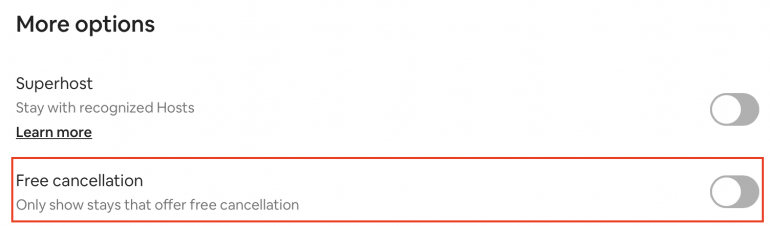 From there, you’ll scroll down to “More Options” and toggle on Airbnb's “Free Cancellation” button.