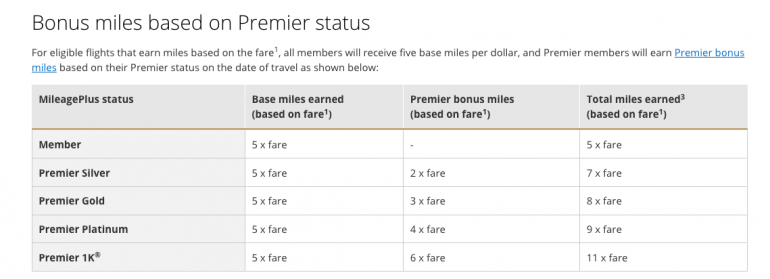 The number of miles you earn varies by airline. Most award you miles based on the cash price of your ticket. For example, United Airlines’ MileagePlus program members earn 5 MileagePlus miles per dollar spent on qualifying tickets. Premier members of the program get bonus miles on top of that.