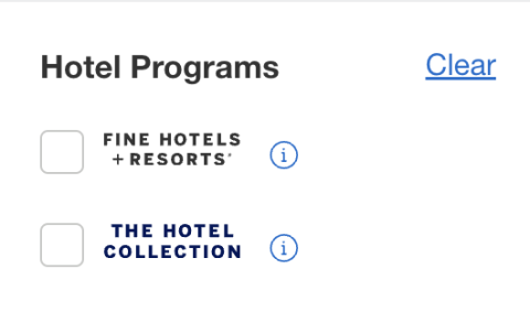 Since the American Express travel portal includes a wide variety of hotels, it is possible to filter down to properties eligible for the statement credit. Click the boxes in the sidebar under “Hotel Programs,” as seen in the image below.