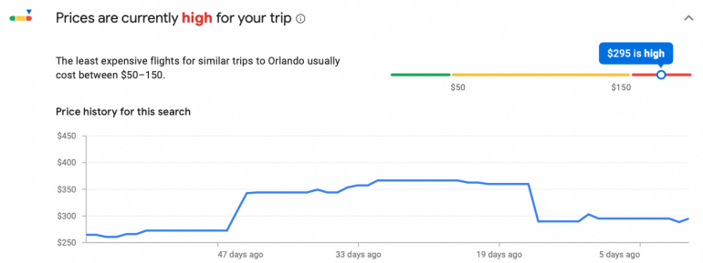 Flight prices rise and fall as airlines attempt to predict demand. By waiting for low prices, then jumping on them, you can save substantial amounts of money. Google Flights has a handy feature for this. When searching flights, Google will pop up with a tracker that’ll show you the average rates for your tickets and when to book flights to save money: