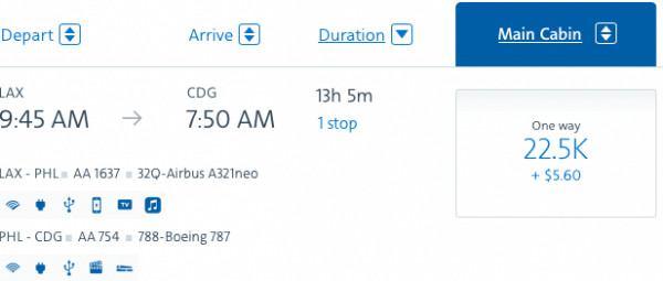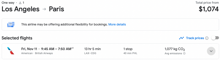 Let’s look at a one-way economy flight from Los Angeles to Paris. One example would set you back $1,074 for a one-way ticket.