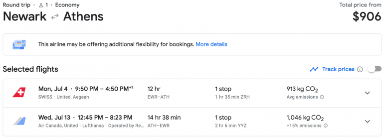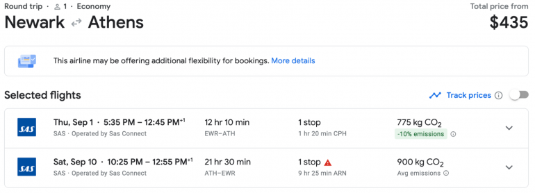 The same is true when traveling during the shoulder seasons. Depending on where you’re going, this is likely during the spring or fall. And flight tickets won’t be the only thing that’s cheaper — hotels will cost less, restaurants won’t have trotted out tourist menus and tours can be less crowded. For example, here's a ticket from New York to Greece at the beginning of September.