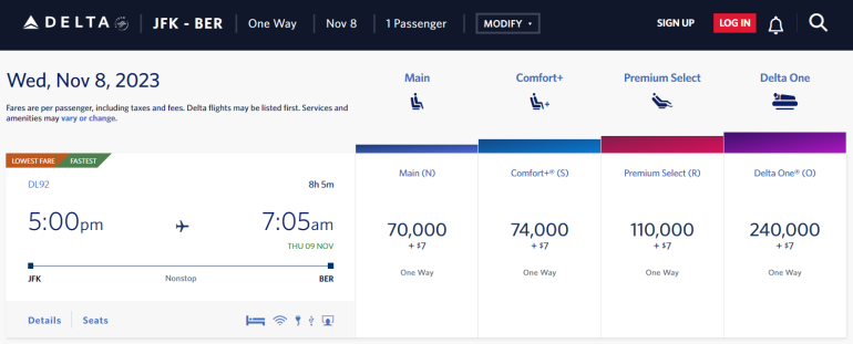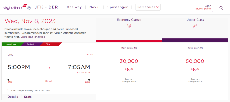 For example, this economy award flight from New York-John F. Kennedy to Berlin in November requires 30,000 Virgin points versus 70,000 Delta SkyMiles. And the savings are even more exceptional in business class: 50,000 Virgin points versus 240,000 Delta SkyMiles.