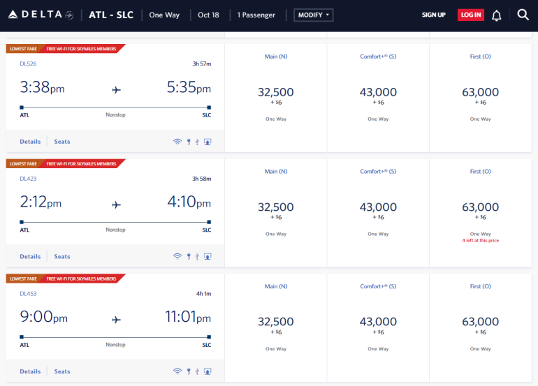 For example, take a nonstop award flight from Atlanta to Salt Lake City on Oct. 18. At the time of writing, Delta is charging 32,500 SkyMiles for economy awards on many flights that day.