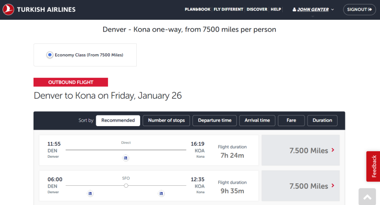 Turkish's online award search tool is wonky; but, if you can find award space, you'll pay 7,500 miles each way for economy and 12,500 miles each way in business class.