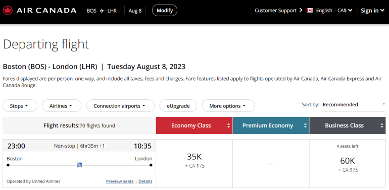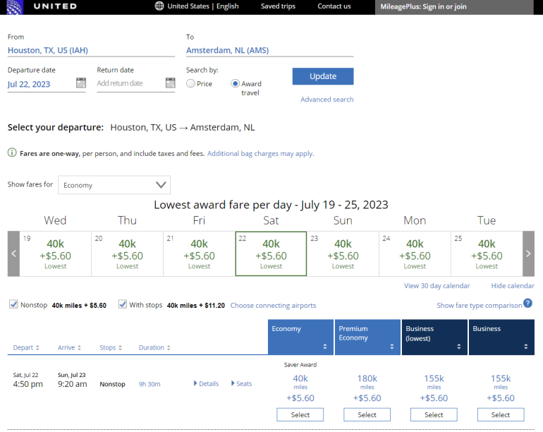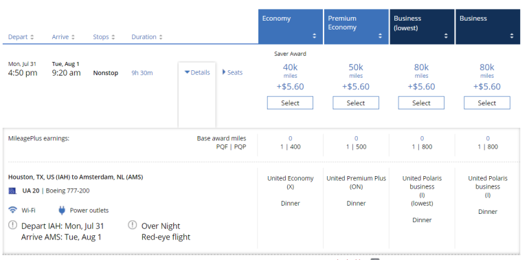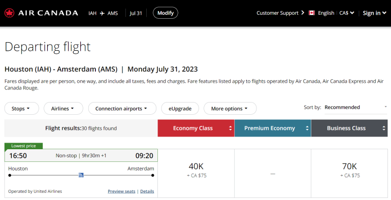 If you need to fly further, itineraries covering up to 6,000 miles in distance cost 70,000 Aeroplan points. That means you can fly from Houston to Amsterdam for 70,000 Aeroplan points instead of 80,000 United miles.
