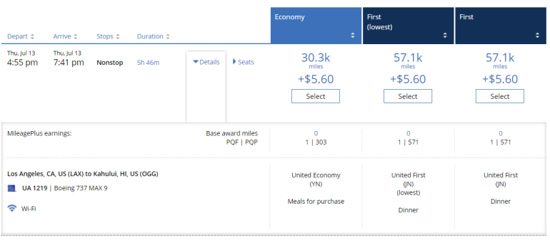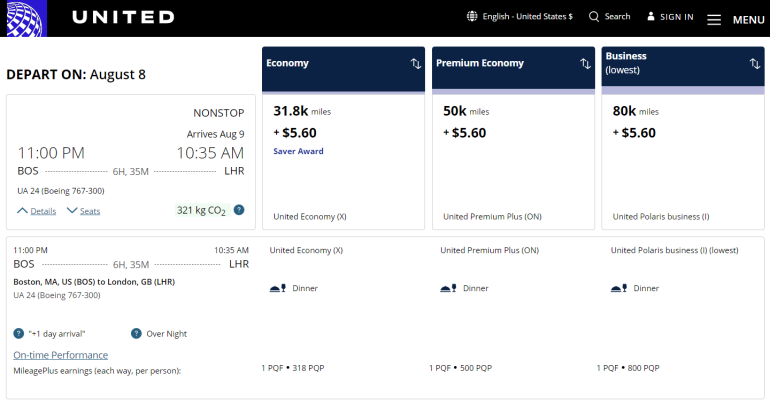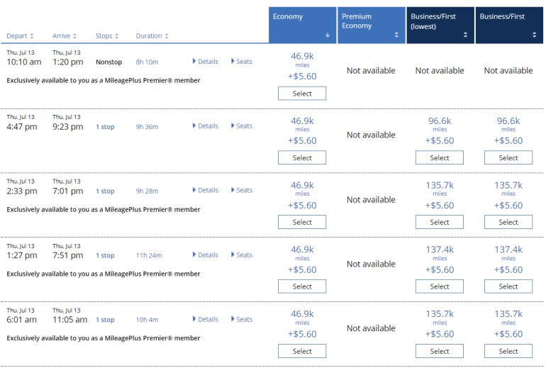 That means you can book the same United awards for a fraction of the mileage cost, depending on what United decides to charge that day. For example, the same award above costs more than 30,000 United miles one-way through MileagePlus.