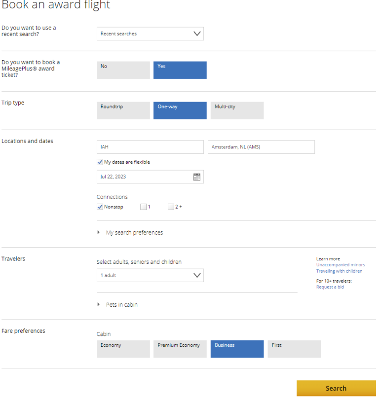 You don't necessarily want to start your award search on United's homepage. Instead, use this link to start your award search. Select the "book a MileagePlus® award ticket" option and enter your origin, destination, number of travelers and class of service.