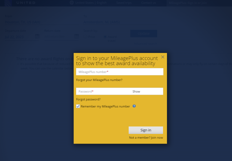 United will prompt you to log into your account. You'll only want to log into your account if you're using United miles. If you want to book United saver awards through partners, click the "X" at the top right of the pop-up box — or just press the escape key.