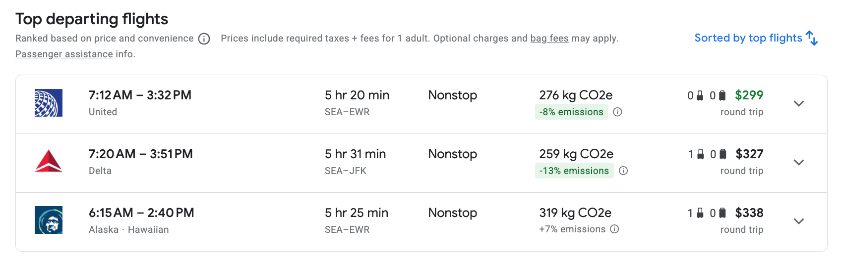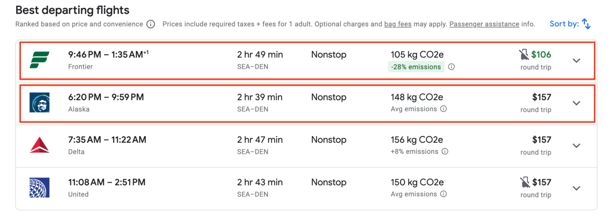 For example, let’s consider the Google Flights results for a flight from Seattle to Denver.