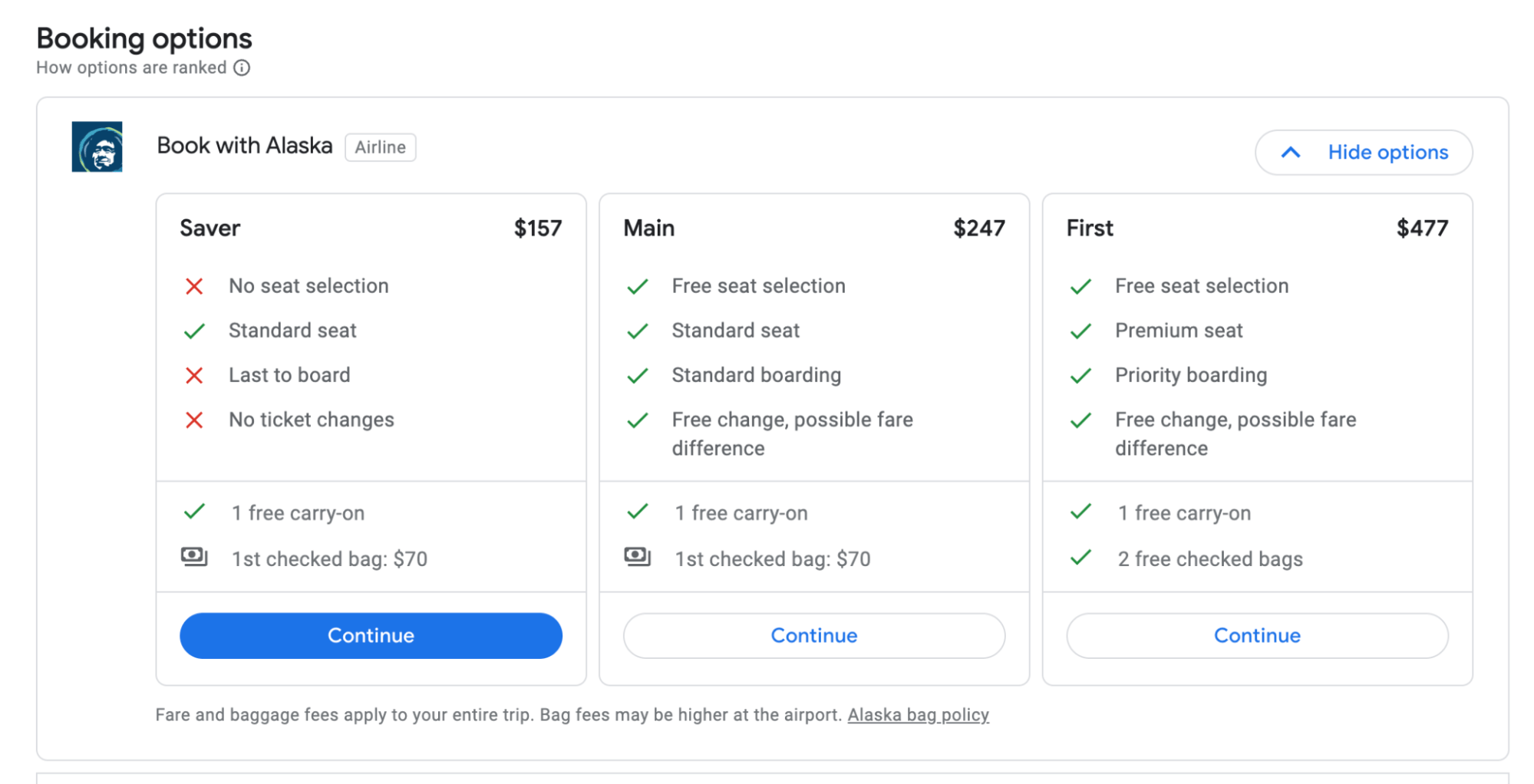 It looks like the total for Frontier is $324.96 and the total for Alaska is $156.19 — a huge difference. However, since Alaska did not include checked bags in its checkout flow (while Frontier did), we have to add that price manually to the total ourselves. Searching for Alaska’s checked bag policy shows that it charges $35 each way for the first checked bag, so $70 for our round-trip fare.
