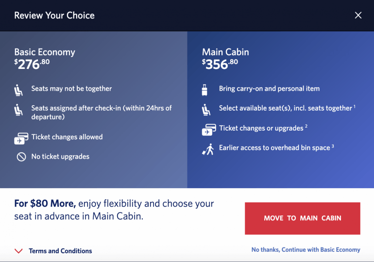 Delta is especially tricky on its website, making its “move to main cabin” button look like the default while minimizing the prominence of its basic economy option.