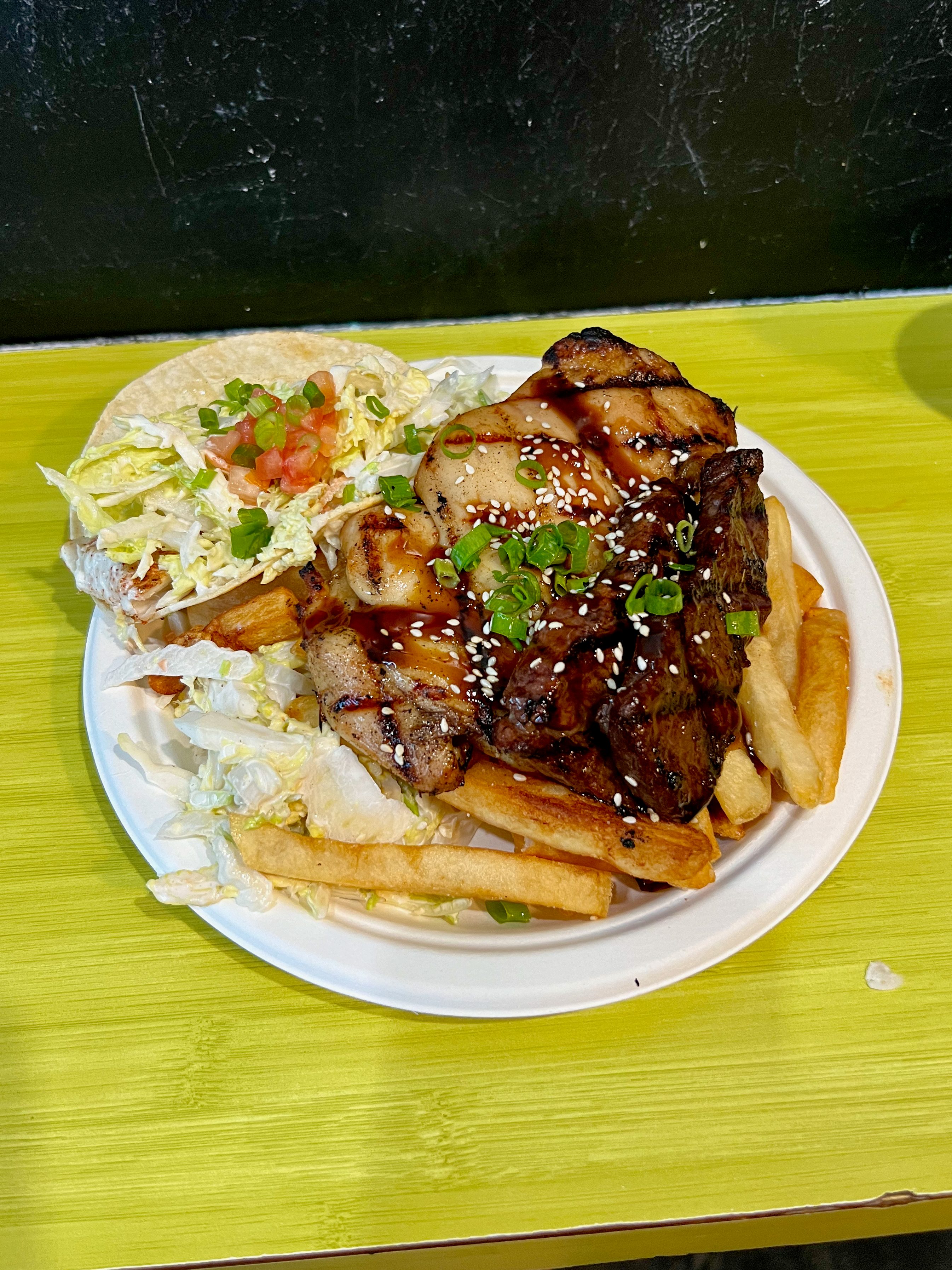 If you’re on the beach at Waikiki, grab lunch at Steak Shack at the Outrigger Waikiki or Happy’s Snack Bar behind the Hale Koa.