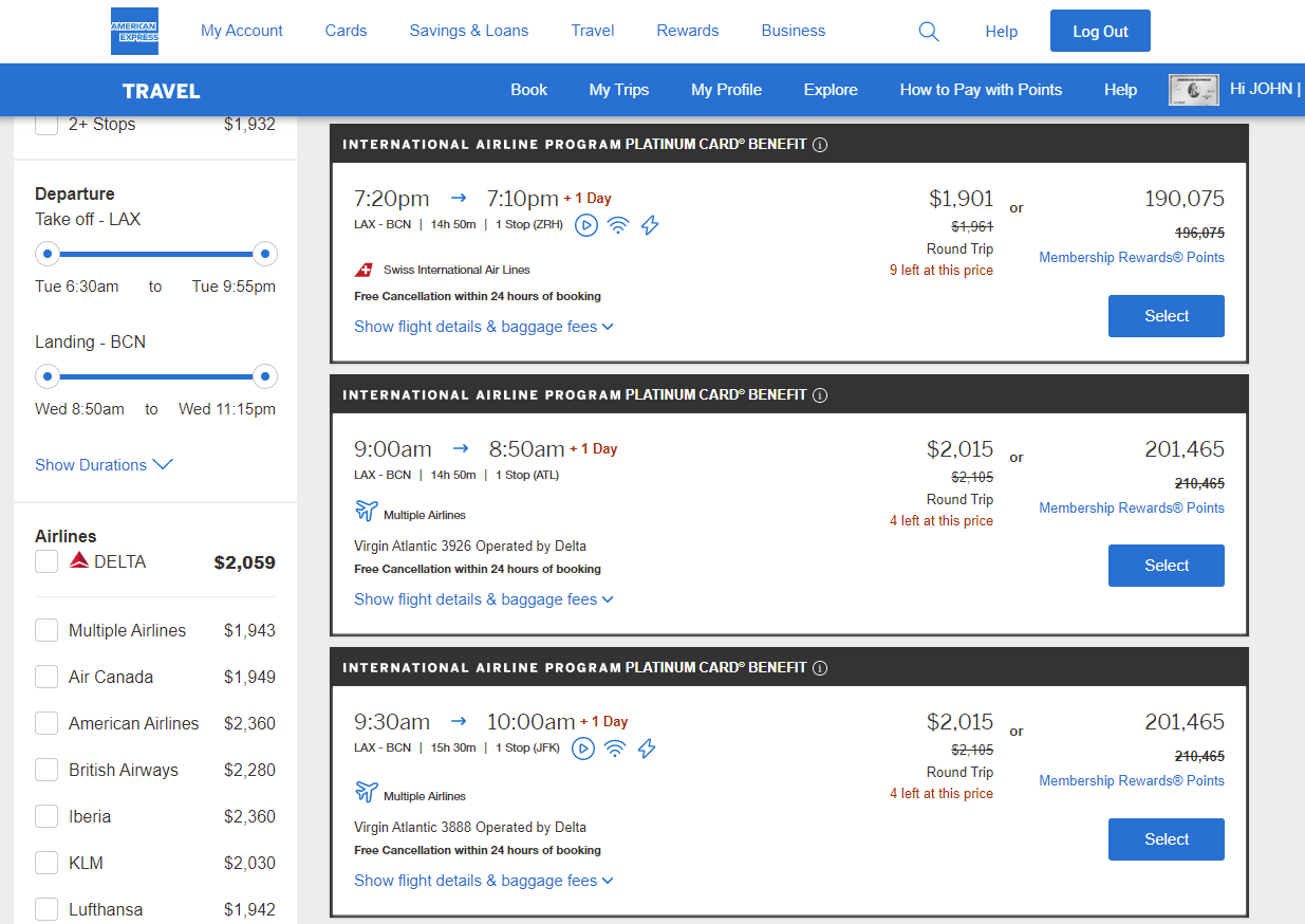 Cardholders can book flights on one of dozens of international airlines via the AmEx Travel portal; though the discount varies based on the airline, route and date, the savings can range from hundreds to thousands of dollars.